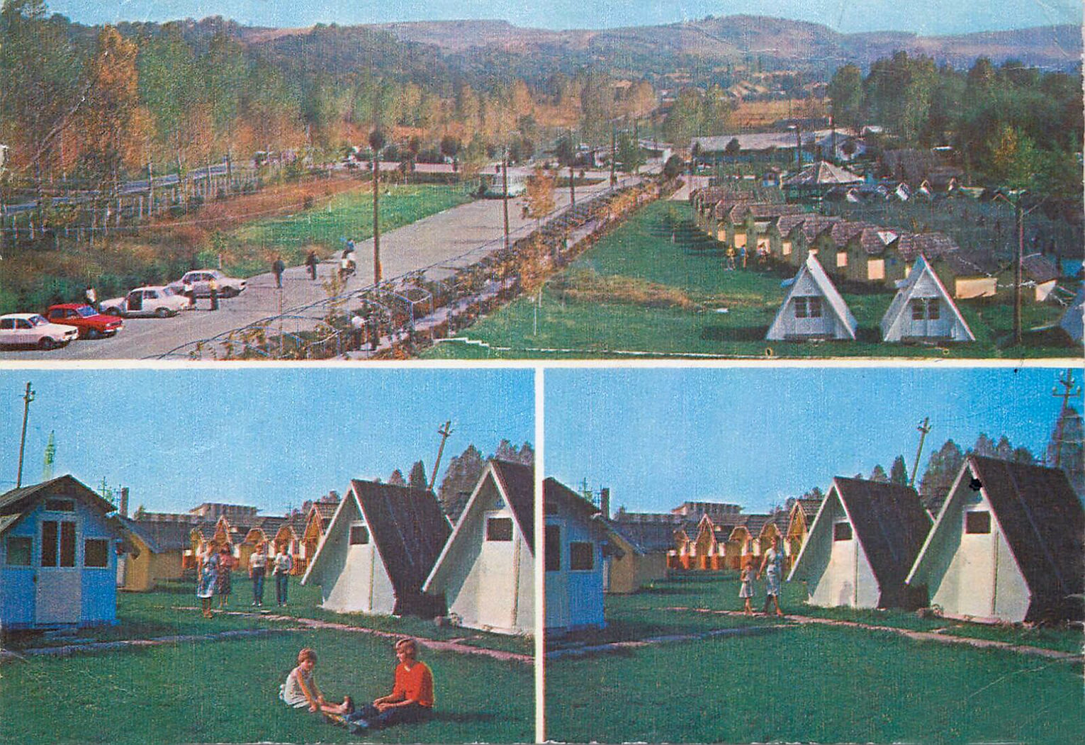 Alte trei imagini arată stațiunea în anul 1989, înainte de căderea comunismului. Imaginile înfățișează zona de cazare în cabane de lemn de la stațiune.